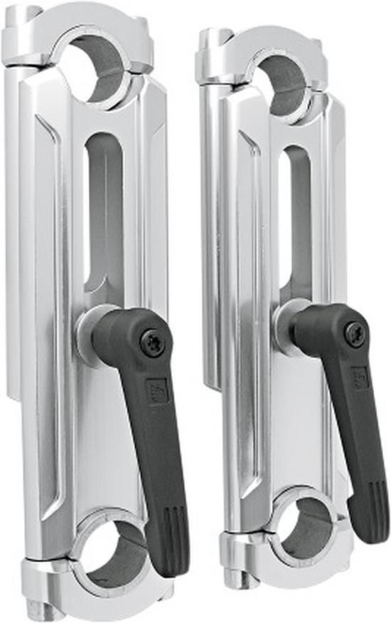 - Rox Height Adjustable Handlebar Risers.**NOW INCLUDES WRENCHLESS LEVERS** -Independent left and right risers adapt to any “T-stem” width making them very universal and usable on different makes and models -Take the guess work out of deciding how high you want your handlebars -Provides you the option of fitting one sled to multiple riders -Handlebar height can be adjusted for different conditions and riding techniques; lower for sit down trail riding and river racing, higher for stand-up ditch banging and backcountry boon docking -Handlebars can be lowered for easier fitment of sled cover when trailering -Two adjustable heights to chose from, 4”-6” and 6”-8-1/4” – Rox Elite Series risers feature a location locking adapter that allow you to clamp standard 7/8” or 1-1/8” taper bars -Premium anodized finish -Note: Extended throttle cable and brake line may be required to accommodate taller risers, always check that you have adequate length before installing risers and operating vehicle. Patented by the US Patent and Trademark Office under US Patent #7,685,904